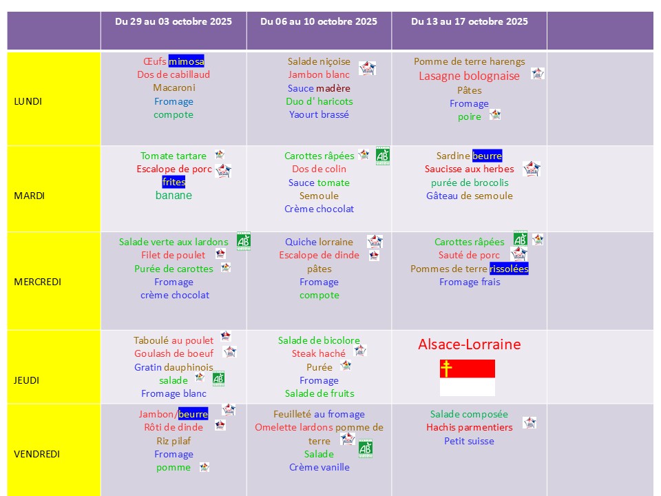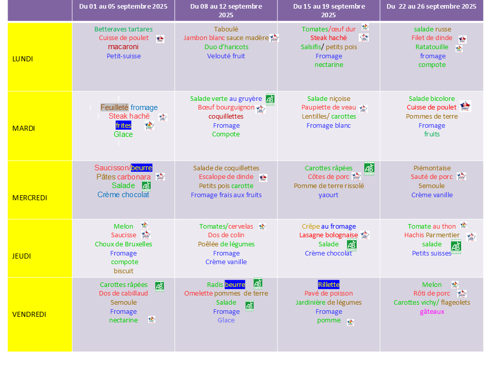 Ces menus sont indicatifs. Leurs réalisations peuvent être modifiées (exemple : dépendance de livraisons).
