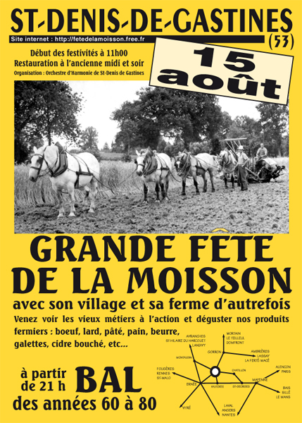 La fête de la moisson c’est 600 personnes bénévoles qui s’affairent pour organiser une rétrospective de la moisson. Elle est organisée toute les 2 ans (les années paires) par l'Harmonie de Saint Denis de Gastines